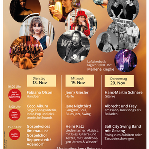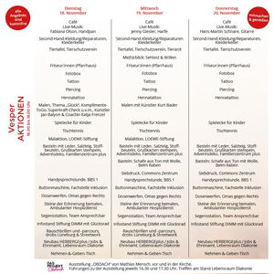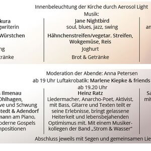 Ab 19.00 Uhr startet täglich die Luftakrobatik-Show von Marlene Kiepke. Am Dienstag bringen die Gospelvoices Ilmenau von Tina Ohlhagen und ein Gospelchor unter der Leitung von Eggo Fuhrmann Schwung und Soul mit. Am Mittwoch ist Heinz Ratz auf der Bühne: Der Liedermacher, Anarcho-Poet und Aktivist engagiert sich mit Projekten u.a. gegen Armut, gegen Rechts und für Geflüchtete. Er hat selbst schon Obdachlosigkeit erfahren. Mit Bass, Gitarre und Texten teilt er seine Erlebnisse auf der Vesperbühne, bringt gelassene Heiterkeit und lebensbejahenden Optimismus mit. Heinz Ratz kommt mit einem Musikerkollegen aus der gemeinsamen Band „Strom & Wasser“; sie haben Lieder vom neuen Album „Plan C“ dabei.