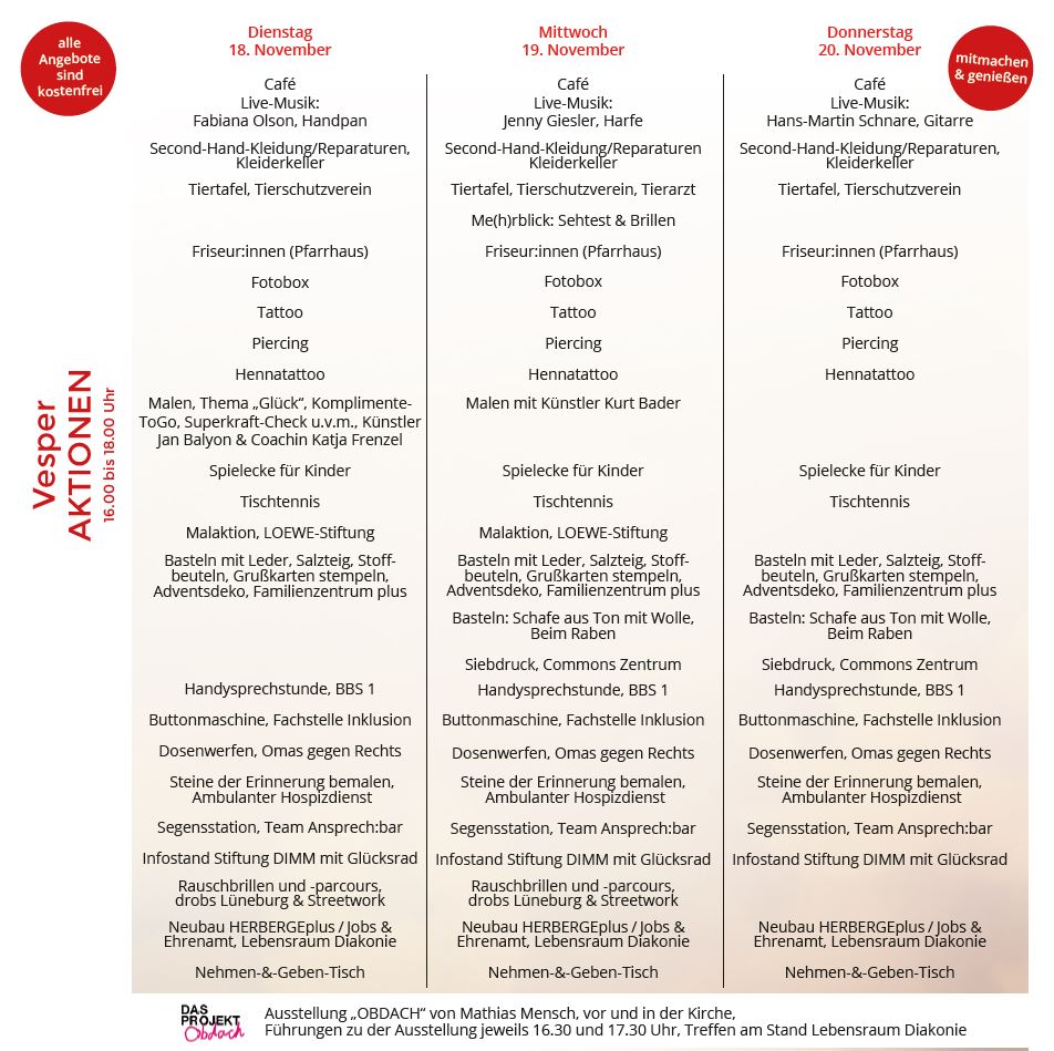 Das Programm und aktuelle Informationen finden Sie unter www.vesperkirche-lueneburg.de und auf Instagram.