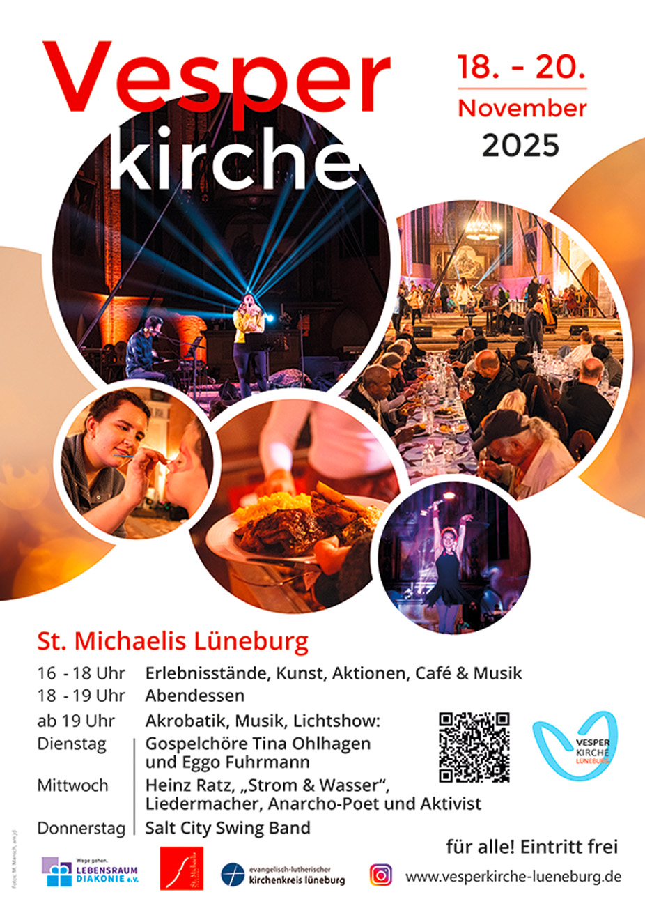 Von Dienstag, 18. bis Donnerstag, 20. November werden wieder hunderte Besucherinnen und Besucher in der Lüneburger Altstadtkirche St. Michaelis zum Vesperkirchen-Event erwartet. Zum fünften Mal finden die Aktionstage mit nachmittäglichen Angeboten, Bühnenprogramm und warmen Abendessen statt. „Die Angebote sind kostenfrei. Eingeladen zur Vesperkirche sind ausdrücklich alle, ob arm oder reich, jung oder alt“, macht das Organisationsteam von Diakonie und Kirche deutlich.