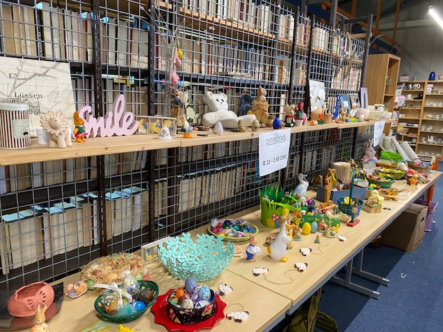Die Hasen waren schon fleißig und haben einiges gesammelt - wer noch Dekoration und kleine Geschenke benötigt, wird in unseren Sozialkaufhäusern fündig und kann für sehr wenig Geld tolle Schnäppchen machen. Die Fotos zeigen das Angebot bei Sack & Pack, wo man nicht nur gute Möbel kaufen kann, sondern auch Haushaltswaren, Bücher, CDs und andere Dekoartikel. Aber auch in unseren anderen Sozialkaufhäusern geht es österlich zu – ein Besuch lohnt sich!